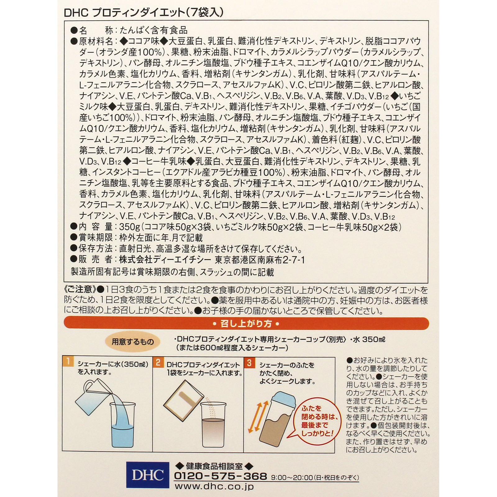 Please prepare a separately sold “DHC Protein Diet Shaker Cup” or a shaker that holds about 600 ml, and 350 ml of water.