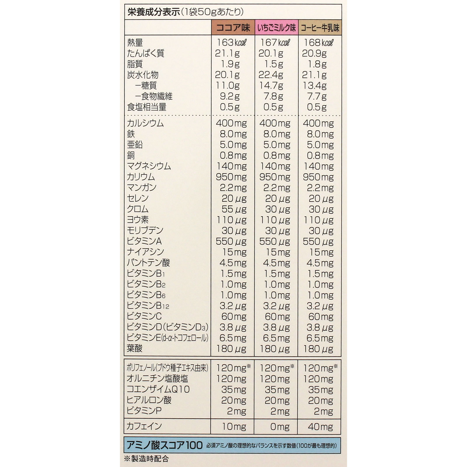 <Nutritional Information> Per 50g bag: Cocoa-flavored polyphenols (derived from grape seed extract)…120mg* Ornithine hydrochloride…120mg Coenzyme Q10…35mg Hyaluronic acid…20mg Vitamin P…2mg Caffeine…10mg Calcium…400mg Iron…8.0mg Zinc…5.0mg Copper…0.8mg Magnesium…140mg Potassium…950mg Manganese…2.2mg Selenium…20μg Chromium…55μg Iodine…110μg Molybdenum…30μg Vitamin A…550μg Niacin…15mg Pantothenic acid…4.5mg Vitamin B1…1.5mg Vitamin B2…1.0mg Vitamin B6…1.0mg Vitamin B12…3.2μg Vitamin C…60mg Vitamin D (Vitamin D3)…3.8μg Vitamin E (d-α-tocopherol) 6.5mg Folic acid 180μg â—‹Strawberry milk flavored polyphenol (derived from grape seed extract) 120mg* Ornithine hydrochloride 120mg Coenzyme Q10 35mg Hyaluronic acid 20mg Vitamin P 2mg Caffeine 0mg Calcium 400mg Iron 8.0mg Zinc 5.0mg Copper 0.8mg Magnesium 140mg Potassium 950mg Manganese 2.2mg Selenium 20μg Chromium 30μg Iodine 110μg Molybdenum 30μg Vitamin A 550μg Niacin 15mg Pantothenic acid 4.5mg Vitamin B1 1.5mg Vitamin B2 1.0mg Vitamin B6 1.0mg Vitamin B12 3.2μg Vitamin C 60mg Vitamin D (vitamin D3) 3.8μg Vitamin E (d-α-tocopherol) 6.5mg Folic acid 180μg â—‹ Coffee milk flavor polyphenol (derived from grape seed extract) 120mg * Ornithine hydrochloride 120mg Coenzyme Q10 35mg Hyaluronic acid 20mg Vitamin P 2mg Caffeine 40mg Calcium 400mg Iron 8.0mg Zinc 5.0mg Copper 0.8mg Magnesium 140mg Potassium 950mg Manganese 2.2mg Selenium 20μg Chromium 30μg Iodine 110μg Molybdenum 30μg Vitamin A 550μg Niacin 15mg Pantothenic acid 4.5mg Vitamin B1 1.5mg Vitamin B2 1.0mg Vitamin B6 1.0mg Vitamin B12: 3.2μg Vitamin C: 60mg Vitamin D (Vitamin D3): 3.8μg Vitamin E (d-α-tocopherol): 6.5mg Folic acid: 180μg *Incorporated at time of manufacture